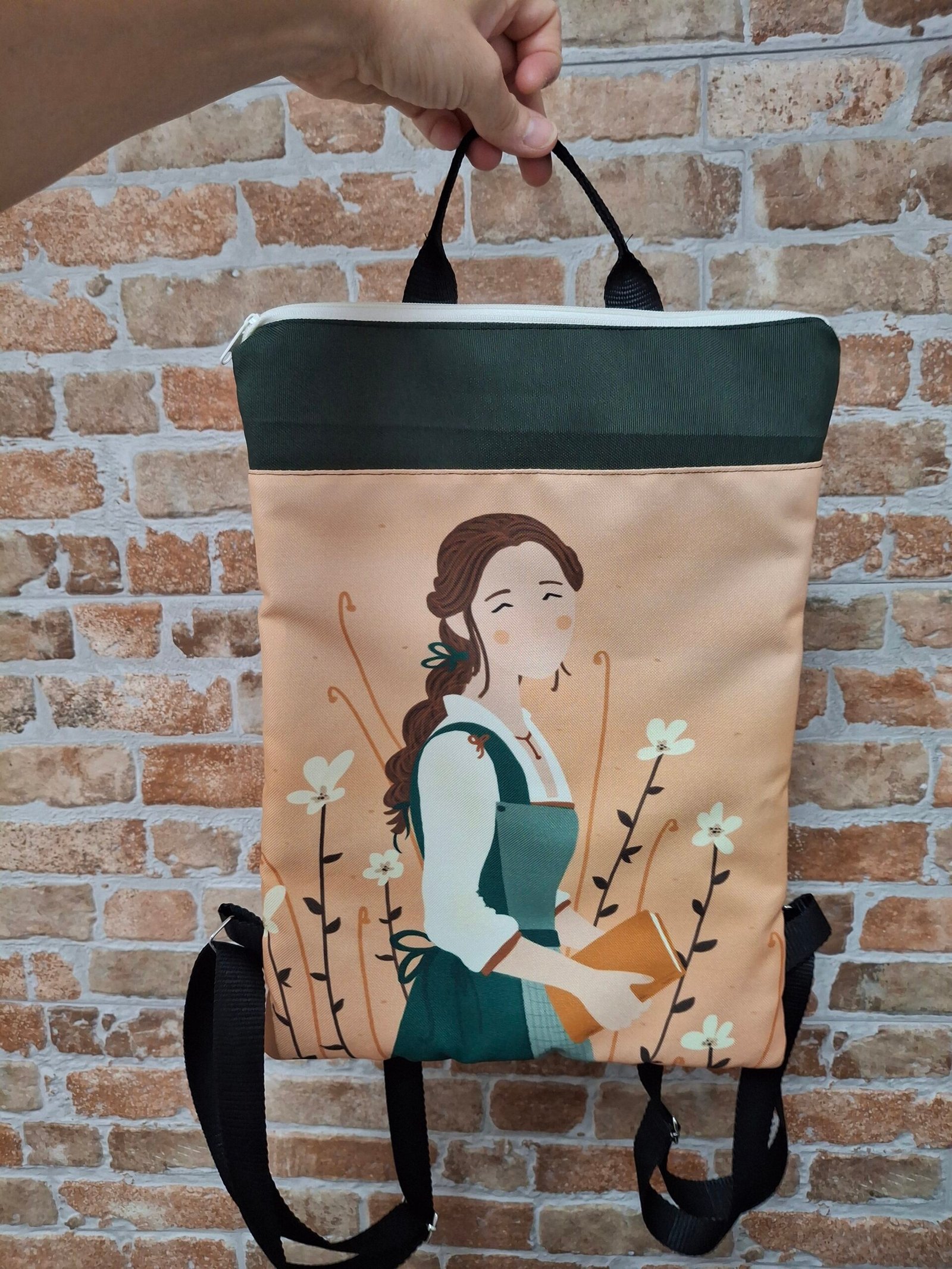 Mochila con la ilustración de bella diseñada por la ilustradora valenciana Laura Guiomar combinada en verde botella y cremallera en color amarillo crudo que le da un toque de elegancia.
