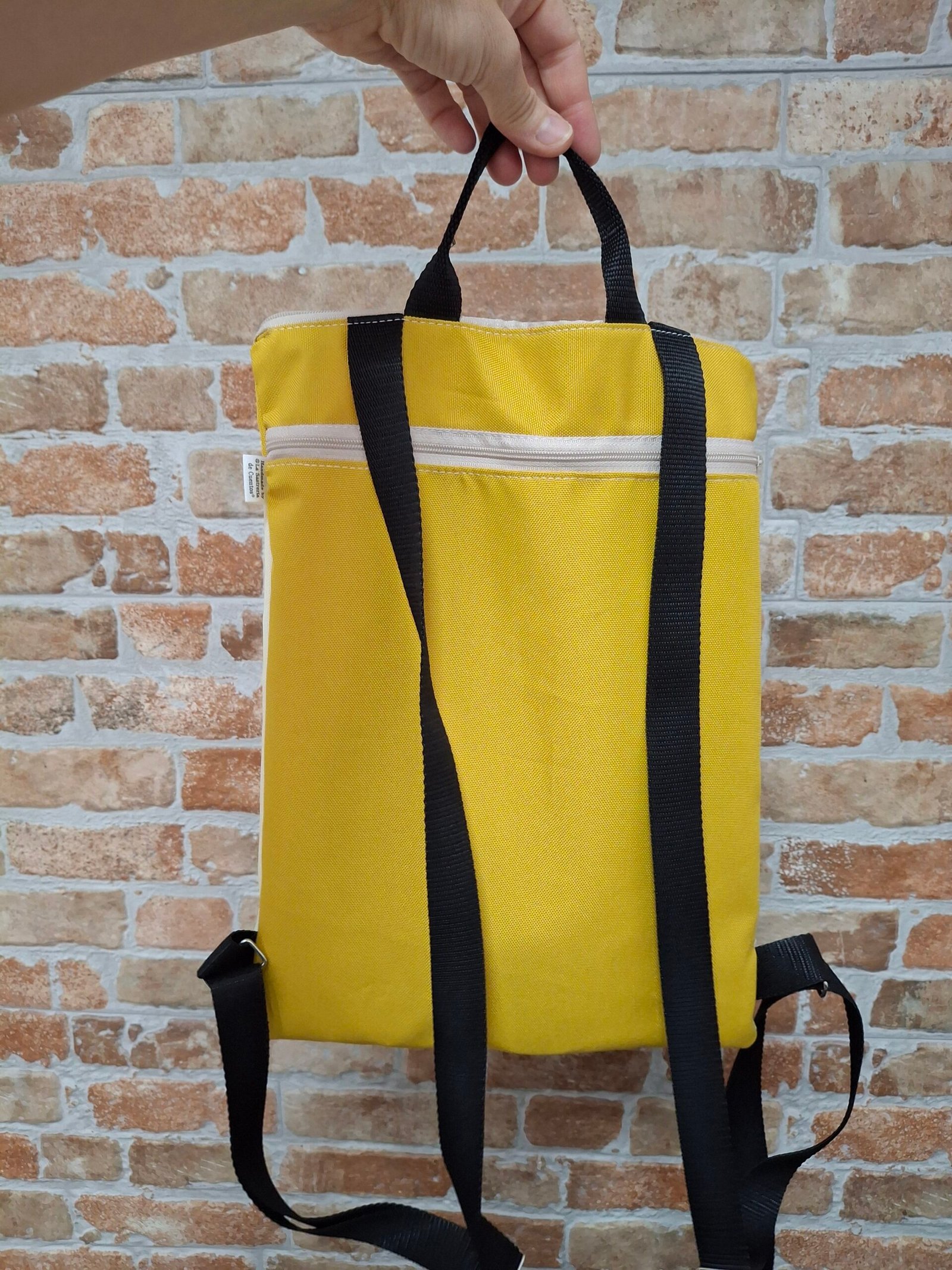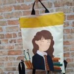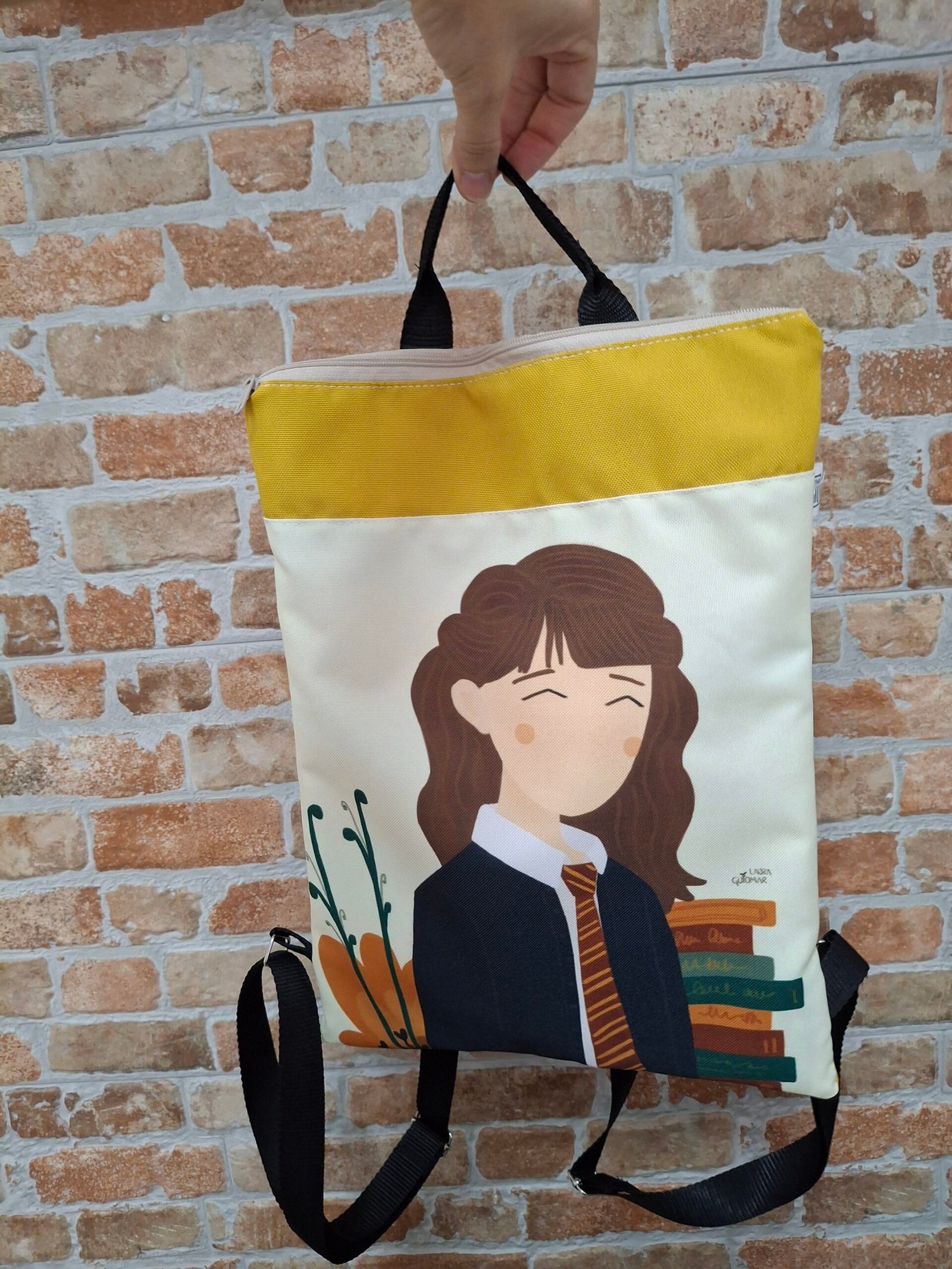 Mochila con la ilustración de Hermione diseñada por la ilustradora valenciana Laura Guiomar combinada en amarillo yema y cremallera en color beige crudo que le da un toque de elegancia.