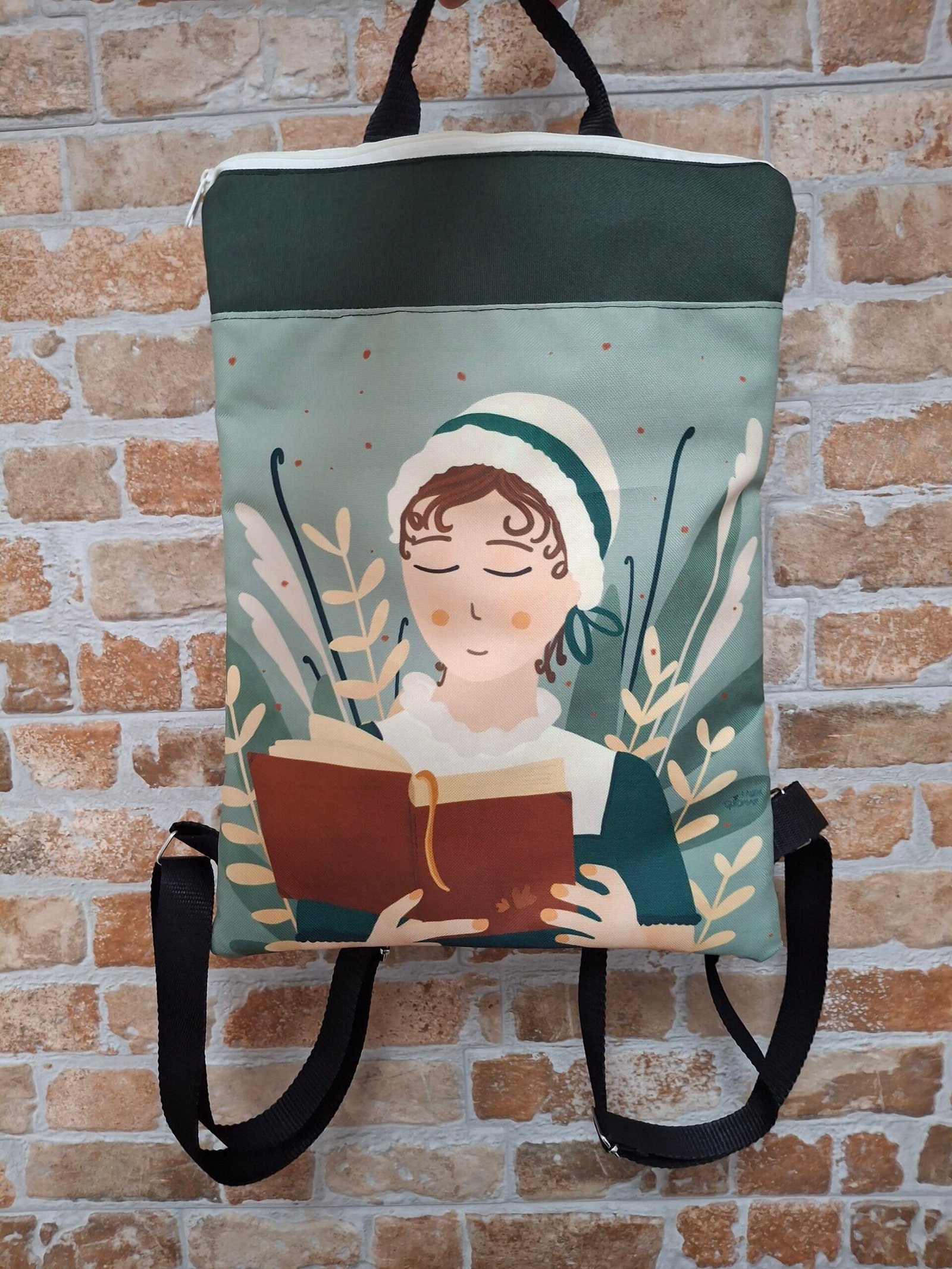 Mochila con la ilustración de Jane Austen diseñada por la ilustradora valenciana Laura Guiomar combinada en verde botella y cremallera en color amarillo crudo que le da un toque de elegancia.