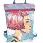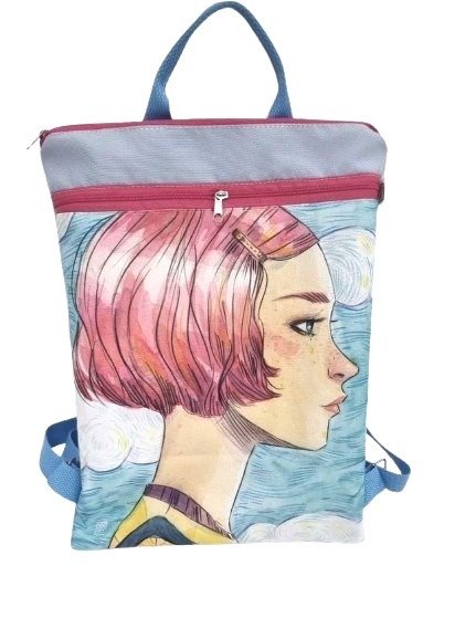 Mochila con la ilustración de Esther Gili combinada en azul clarito y cremallera fucsia que le aporta un toque elegancia.