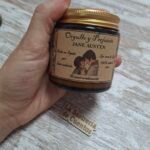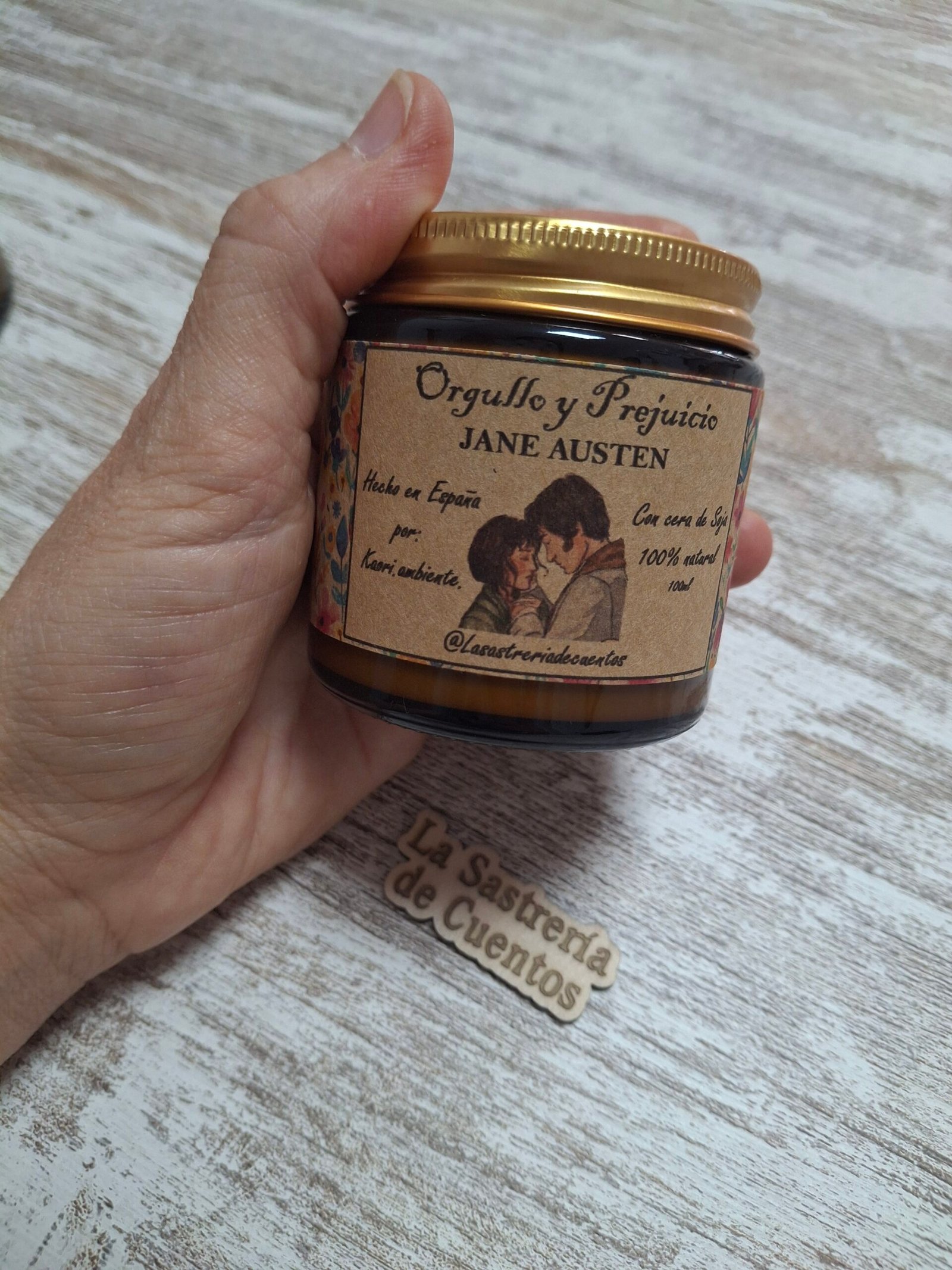 Una velita hecha artesanalmente con cera de soja natural 100 %.  La etiqueta está diseñada en nuestro Taller.